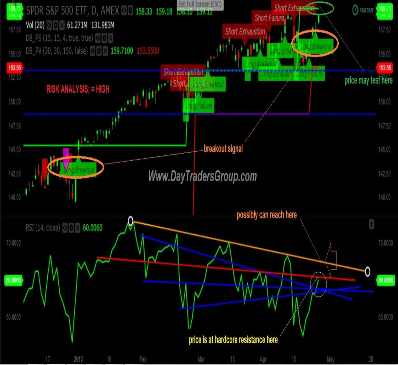 On a break below 154.08 we will go short Spy with May 154 PUTS targeting the following support levels, conversely should spy break resistance above 157.84 we will go long targeting the following resistance levels