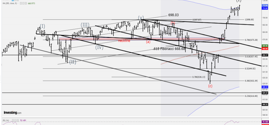 SPY is now pressing into a structurally critical zone near 714, which sits at the upper boundary of the recent impulse leg and just above the prior distribution range that capped price around 698. What stands out here is not simply the breakout, but the lack of meaningful consolidation beneath it. Price moved impulsively from the 630s into the 710s, reclaiming the neckline and the 0.786 retracement near 695.88 with authority, and that type of vertical expansion often requires either continuation through momentum or a corrective backfill to rebalance positioning. From a structural standpoint, the 698.00 to 695.88 region now becomes the most important support band. Holding above that zone keeps the breakout valid and opens the path toward 720 followed by 724.44, which aligns with the upper channel extension. A clean acceptance above 715 increases the probability of a continuation move into that 720 to 725 region, where extension exhaustion and profit taking would be expected. However, the more nuanced layer here comes from positioning and momentum conditions. Gamma exposure shows a flip level near 707.44, with price currently above that threshold, placing the market in a positive gamma regime where dealers tend to dampen volatility and support mean reversion. This dynamic explains the controlled grind higher rather than chaotic expansion. Additionally, the call wall sits near 710 while the put wall is anchored at 700, effectively creating a short-term dealer-defined range. Sustained trade above 710 forces dealers into supportive hedging flows, reinforcing upside drift, but a loss of 707.44 shifts the market back into negative gamma, where volatility can expand quickly. That is the pivot where the tone of the market changes.