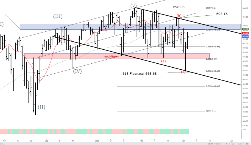That zone aligns precisely with the 0.618 Fibonacci retracement (669) from the recent swing and the lower boundary of the steeper descending channel visible on the daily timeframe. Conversely, should buyers demonstrate sufficient conviction to reclaim and hold above 688ish, the bearish configuration would lose momentum. Such a development would likely trigger short-covering and propel price back into the 690-693 resistance shelf, where the 0.786 retracement level and the overarching descending trendline converge.
