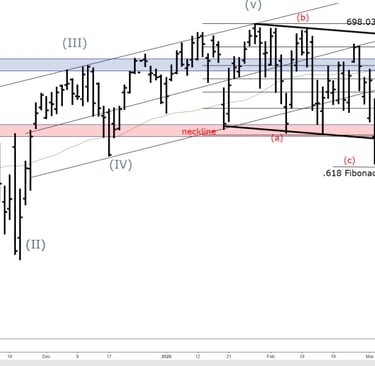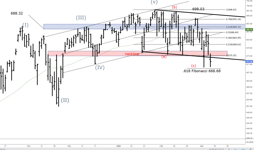 Last week we were unequivocal: 668 was the level that mattered most.With SPY trading near 690, we repeatedly emphasized that the daily chart was constructing a clear corrective architecture pointing directly toward the 0.618 Fibonacci retracement at 668.68. That confluence, where the projected wave (c) target aligned with the lower boundary of the developing descending wedge, the neckline extension, and a prior liquidity pocket, was not arbitrary. When multiple independent technical factors converge at a single price zone, the market frequently turns that area into the decisive battleground for the next directional phase.This week delivered precisely what we anticipated.SPY printed an intraday low of 669.66 (March 5 session), effectively tagging the 668.68 target to within a few handles. The level held as temporary exhaustion, producing a reflexive bounce that has carried price back into the 676-678 region as we head into the close. This reaction is textbook: deep Fibonacci and structural support zones often generate sharp counter-trend recoveries before the larger trend reasserts itself.
